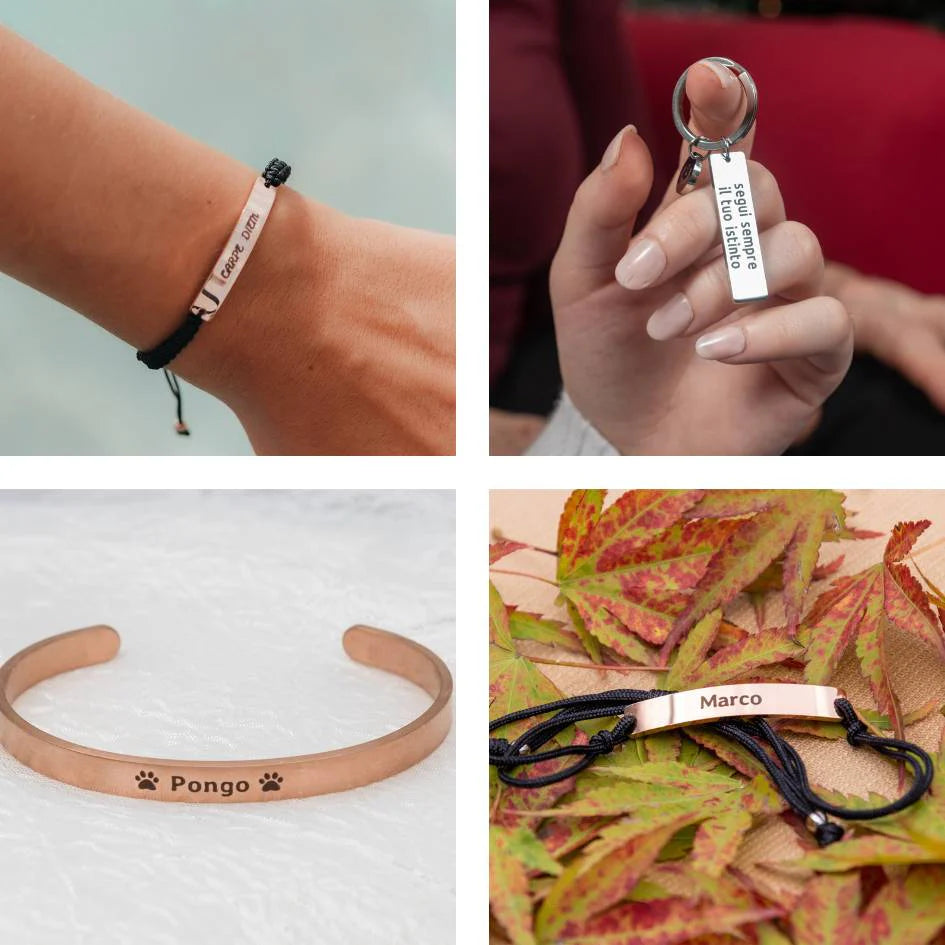 Che si tratti di un regalo di un anniversario, di un compleanno o di un altro momento unico, la nostra collezione di braccialetti, collane, anelli e portachiavi personalizzati offre un tocco unico che lascerà un segno indelebile nel cuore del destinatario.
